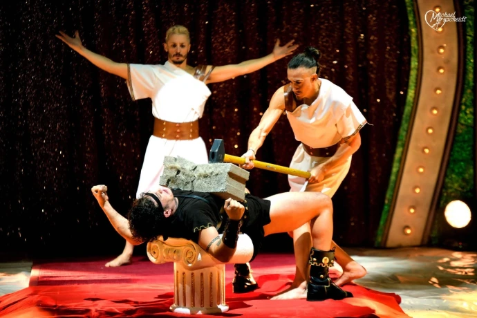 Ives Triberti présente un numéro d’homme fort inédit sous le chapiteau Nicolas Bouglione. Repoussant les limites du corps humain, sa performance spectaculaire et originale promet d’émerveiller le public et de marquer les esprits.