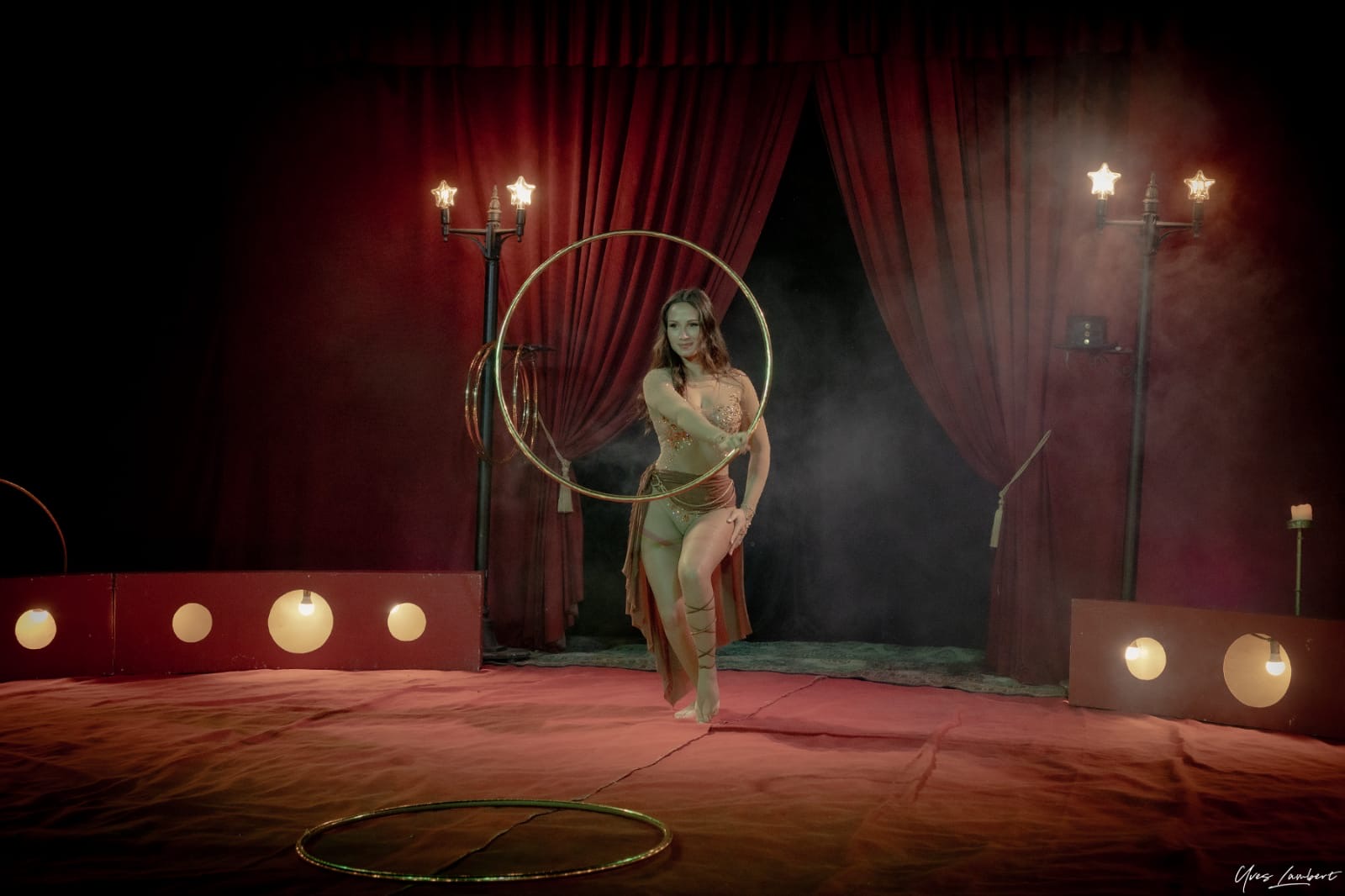 Julia Galeoti présente un numéro de hula hoop alliant technique, rythme et coordination. Elle manipule plusieurs cerceaux avec précision et fluidité, créant des figures originales qui captent l’attention du public. Son numéro combine habileté et esthétique, offrant un spectacle à la fois dynamique et visuellement attractif.